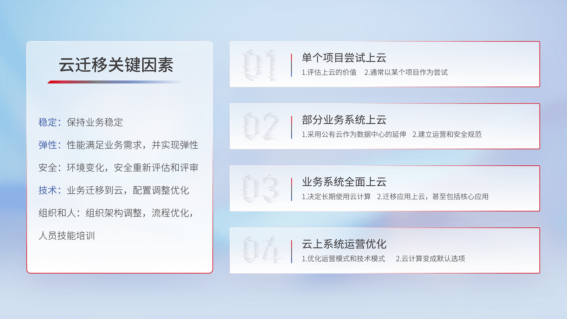 结合实际业务,,从规划设计、、云平台选型、、、、云原生改造、、、数据迁移、、、集成交付,,迁移全过程为客户识别最佳上云路径,,,,做好风险识别管理,,,设计网络架构、、身份权限、、、安全审计合规、、、、操作审计、、、日志审计、、监控告警策略、、、、多站点容灾设计等,,,对云上基础设施进行整体规划,,,,提升IT治理水平,,,,以满足弹性、、、、高可用、、、、高性能的需求。。。